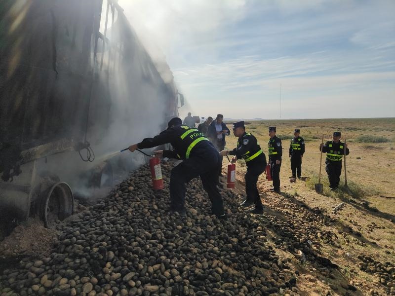 警情就是命令,民警們立即放下手中的工作,準(zhǔn)備滅火救援設(shè)備,于第一時(shí)間趕往現(xiàn)場(chǎng)。到達(dá)后,民警們看到現(xiàn)場(chǎng)濃煙滾滾、火光四濺,一輛半掛車(chē)的尾部輪胎正在燃燒,同時(shí)現(xiàn)場(chǎng)還有其他車(chē)輛“冒險(xiǎn)”經(jīng)過(guò)。隨后民警馬上分成3組投入戰(zhàn)斗。第一組2名民警立即封鎖道路,防止其他車(chē)輛進(jìn)入火場(chǎng);第二組3名民警攜帶滅火器對(duì)明火進(jìn)行撲滅;第三組4名民警在明火撲滅后,隨即沙土掩埋的方式對(duì)著火部位進(jìn)行覆蓋,防止死灰復(fù)燃。經(jīng)過(guò)2個(gè)小時(shí)的連續(xù)作戰(zhàn),火情得以有效控制。