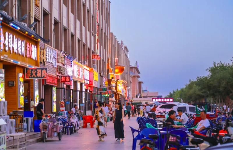 走進(jìn)達(dá)來(lái)呼布鎮(zhèn)各主要街道,濃濃的煙火氣撲面而來(lái)。不少餐廳門(mén)口支起熱鬧的夜市攤位,游客們圍坐在一起,品嘗駝肉、羊肉等當(dāng)?shù)靥厣朗?,歡聲笑語(yǔ)不斷。