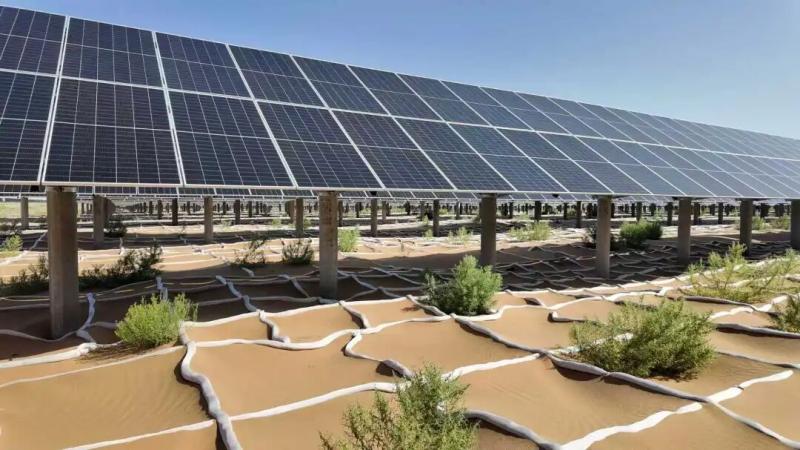 在內(nèi)蒙古華電騰格里清潔能源外送基地,建成的200萬千瓦光伏項(xiàng)目正將清潔能源輸送入網(wǎng)。該項(xiàng)目因地制宜采用“光伏+治沙”的形式,通過板上發(fā)電、板下修復(fù)、板間種植,在治理沙地的同時促進(jìn)節(jié)能降耗,實(shí)現(xiàn)生態(tài)、經(jīng)濟(jì)效益的有機(jī)統(tǒng)一。