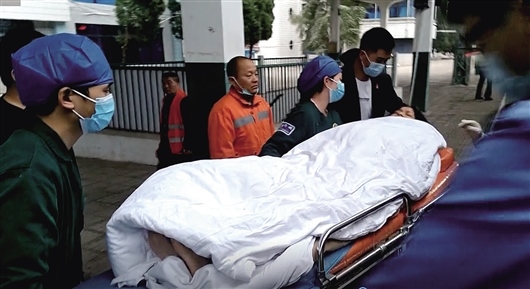 在江西信豐站臨時(shí)???jī)煞昼?,大家協(xié)力將產(chǎn)婦和新生兒抬到120急救車上,送往醫(yī)院進(jìn)一步治療。(圖片由劉晶新提供)