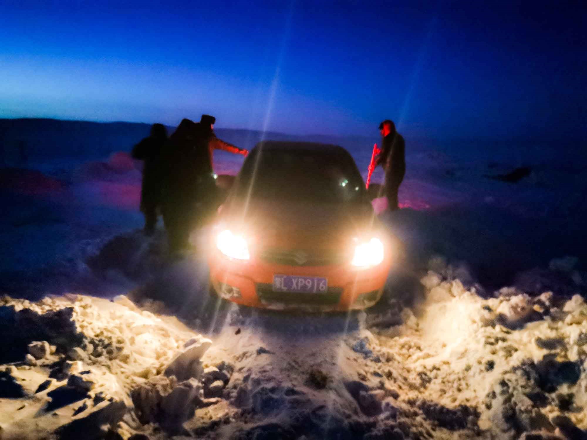 1月17日17時(shí),那木吉拉與弟弟一同駕車返回百靈廟鎮(zhèn),在途經(jīng)一處被風(fēng)谷地時(shí),由于晚上視線較差,且此處坡度較大,不慎陷入雪中無(wú)法動(dòng)彈,只得撥通電話請(qǐng)求派出所救助。草原上沒(méi)有遮蔽物,常常到了下午就刮起大風(fēng),吹得積雪覆蓋在土地上分不清地勢(shì)高低,民警們按著平日下鄉(xiāng)走訪的經(jīng)驗(yàn)摸索前進(jìn),經(jīng)過(guò)近一小時(shí)才到達(dá)現(xiàn)場(chǎng),了解情況后,民警們將準(zhǔn)備好的熱水和棉大衣遞給牧民便展開(kāi)了救援工作。在零下35度的冬夜里,民警們用鐵鍬和雙手經(jīng)過(guò)近兩個(gè)小時(shí)的奮戰(zhàn)終于將40厘米厚的積雪清理干凈,并將被困車輛通過(guò)前拉后推的方式移至平坦區(qū)域。