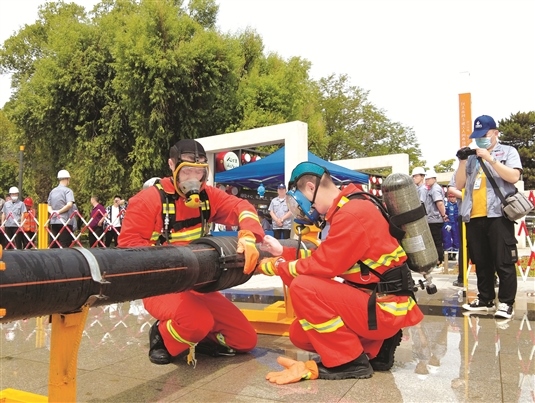 陣陣白煙模擬的是道路中壓燃?xì)夤艿佬孤?,接到報警后?19消防指揮中心第一時間通過應(yīng)急聯(lián)絡(luò)系統(tǒng)通知住建部門和燃?xì)馄髽I(yè)到場處置,同時消防救援力量到達(dá)現(xiàn)場對泄漏點(diǎn)進(jìn)行處置。接到通知后,中浩燃?xì)夤緭屝藜皯?yīng)急處置人員到達(dá)現(xiàn)場,對泄漏區(qū)域20米范圍內(nèi)進(jìn)行圍擋警戒,并攜帶可燃?xì)怏w檢測儀對周邊環(huán)境進(jìn)行檢測,以防人員受傷,保證作業(yè)安全。應(yīng)急處置人員佩戴空氣呼吸器進(jìn)入現(xiàn)場,確定漏點(diǎn)及管道尺寸,用膠帶對漏點(diǎn)進(jìn)行臨時處理,加裝管道抱卡,臨時封堵管道?,F(xiàn)場指揮人員根據(jù)處置情況,集結(jié)隊伍,利用運(yùn)行不停輸維修設(shè)備進(jìn)行管道維修。這一連串的操作下來,泄漏點(diǎn)被及時修好。負(fù)責(zé)此次演練的內(nèi)蒙古中浩燃?xì)庥邢薰究偨?jīng)理賈鵬程介紹,這套不停輸管道維修設(shè)備,既節(jié)約了成本,又能保證安全供氣,能更好地服務(wù)保障廣大市民群眾。