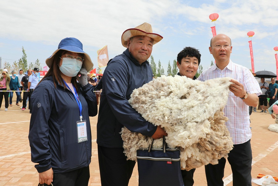 在同步舉行的剪羊毛大賽中,參賽選手們用剪刀和電動剪毛機(jī),在細(xì)毛羊身上翻飛操作,牧民們熟練的身手和精湛的技藝,使一只只羊片刻之間“脫胎換骨”。
