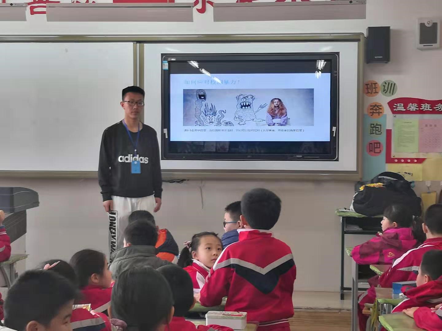只見一個(gè)長(zhǎng)相魁梧的“歹徒”不僅擋住同學(xué)們回家的路,還口出狂言。而路過的幾名同學(xué)正不知所措。原來這是由北垣小學(xué)的師生們正在進(jìn)行校園暴力演習(xí),且當(dāng)天還邀請(qǐng)了52位律師走進(jìn)校園,為同學(xué)們上了一堂生動(dòng)的法律常識(shí)課。