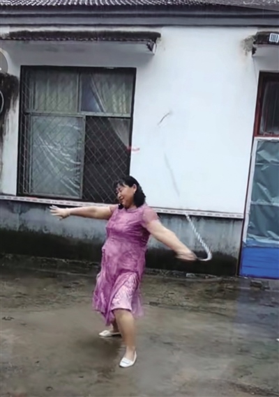 “清水河”大媽與抖音的相遇是在3年前。當(dāng)時(shí),遭遇了親人離世的她悲傷難抑,為了讓她分散注意力,她的女兒幫她下載了抖音。此后,大媽時(shí)常刷刷抖音,也慢慢從中悟出了一個(gè)道理,就是生活中不如意十之八九,人要好好活著,要快樂地活著。很快,大媽就從悲傷中走了出來,也學(xué)著在抖音上拍攝自己的日常。雖然起初視頻點(diǎn)贊量不多,但能記錄下生活的點(diǎn)滴足以讓她格外開心。一直到了去年9月份,大媽無意之中發(fā)布了一條雨中甩鞭子的視頻。視頻中,大媽身著一襲紅裙,有節(jié)奏地甩起了十幾斤重的鐵制麒麟鞭?!芭距⑴距?、啪嗒……”聲聲響亮、威風(fēng)凜凜。就是這條視頻讓她一夜爆紅。此后短短幾天,這條視頻的點(diǎn)贊量就突破了200萬,一時(shí)間,抖音上還掀起了一陣和大媽合拍的熱潮。