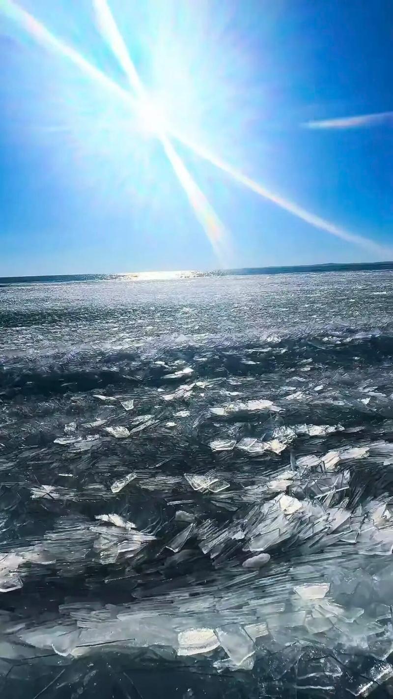 在無(wú)人機(jī)航拍視角下,2239.9平方公里的湖面上,冰排與未完全封凍的水域交織分布,白色冰體與湛藍(lán)湖水相映,宛如大地鋪展的巨型碧玉上鑲嵌的銀紋??拷行牡膮^(qū)域,新凍結(jié)的冰層還呈現(xiàn)出細(xì)膩的冰花紋路,而岸邊的冰排群中,隱約可見(jiàn)因地下泉眼涌動(dòng)形成的“清眼”,表面覆著薄霜,在陽(yáng)光下泛著微光。