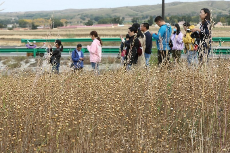 媒體團(tuán)成員到田間地頭了解亞麻籽種植收獲情況