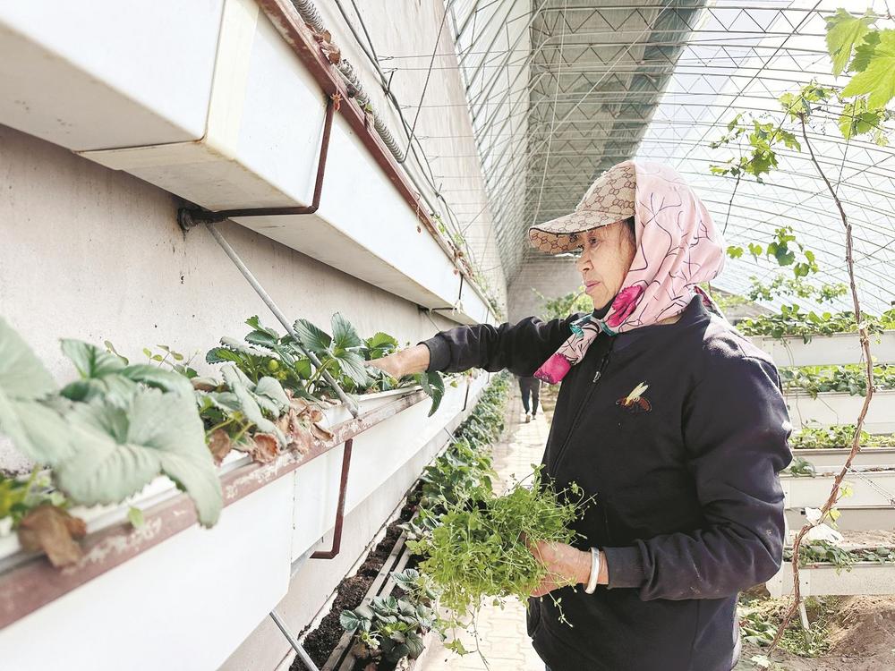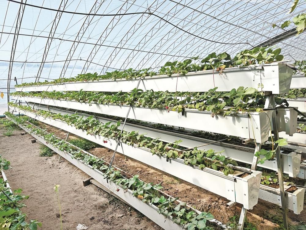 走進(jìn)草莓大棚內(nèi),濃濃的暖意撲面而來。抬眼望去,離地一米多的種植架上種滿了生機(jī)勃勃、長勢喜人的草莓;穿梭在種植架間,一顆顆鮮紅欲滴、圓潤飽滿的草莓宛如璀璨的紅寶石,從綠葉間“探出頭”來,高高地懸掛在空中,散發(fā)著誘人的清香。種植戶牛尚海正在察看采用立體栽培技術(shù)的草莓長勢情況。“這是一種三維立體種植方式,能夠充分利用空間和光照,大幅度提高生產(chǎn)效率。以前一畝地最多種8000株,現(xiàn)在能種2.4萬株,產(chǎn)量提高了3倍,而且草莓個(gè)頭更均勻,賣相更好?!迸I泻8嬖V記者,這種種植方式不僅省工、省力,還降低了勞動(dòng)強(qiáng)度,摘草莓也不用彎腰了。此外,這種種植模式比傳統(tǒng)種植模式每畝節(jié)水50%。