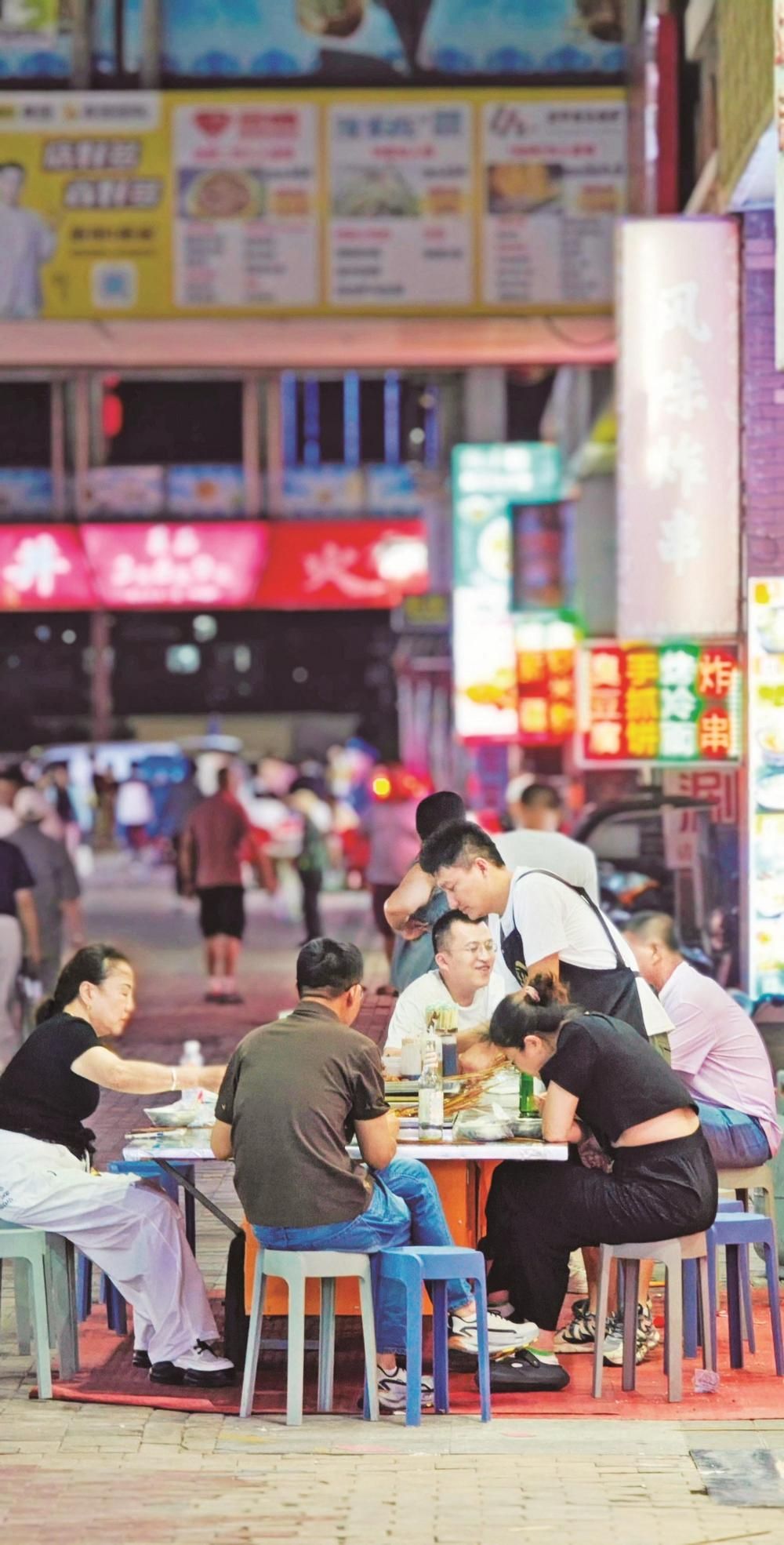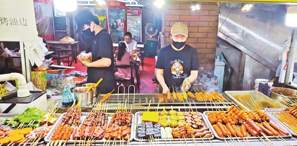 炭火上的羊肉串嗞嗞作響,油脂滴落,迸出金色火花,散發(fā)出誘人的香氣??腿藝谒芰闲∽琅?,手里拿著冰鎮(zhèn)啤酒,碰杯傳出清脆的響聲……這里沒有高檔餐廳的拘謹(jǐn),只有朋友相聚的歡樂和大口吃肉的暢快。大學(xué)生徐瑞虹放暑假后,經(jīng)常和朋友來夜市消暑?!拔覀儙讉€沒事就來萬達金街轉(zhuǎn)一轉(zhuǎn),天太熱了,待在家里也悶,而且夜市里的這些小吃我們都比較喜歡,沒事幾個人喝幾瓶啤酒,聊一聊天,感覺還是很愜意的?!睂τ谀贻p人來說,夜市不僅是美食的聚集地,更是釋放壓力、享受生活的好去處。在這里,他們可以暫時拋開煩惱,盡情享受美食帶來的快樂。