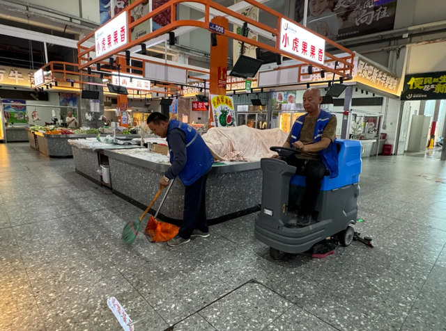 記者在現(xiàn)場看到,市場內(nèi)燈火通明,幾名保潔人員正在細(xì)致地擦拭攤位,有的則在清掃地面上的雜物。而在市場的主通道上,工作人員羅全貴正開著洗地機緩緩前行,機器過后,原本有些油污的地面變得干凈整潔。