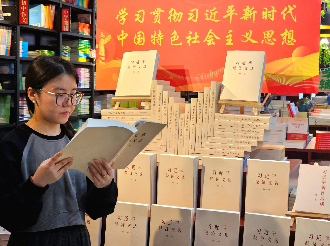 市民殷玥琳正在閱讀《習近平經濟文選》第一卷