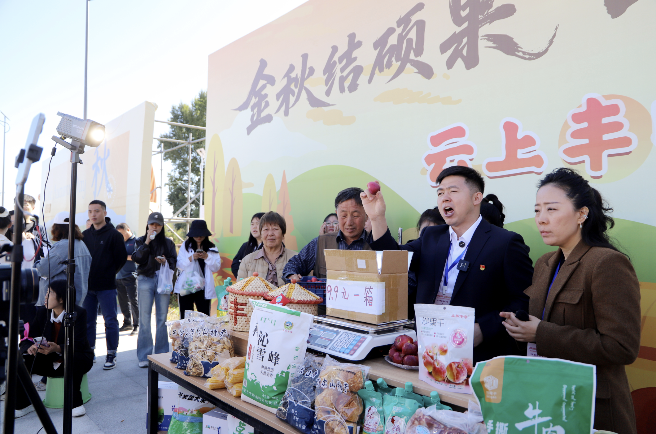 “這都是我們本地的農(nóng)產(chǎn)品,我現(xiàn)在正在豐收節(jié)的現(xiàn)場,各位朋友抓緊下單,興安盟產(chǎn)品不會讓你失望!”活動現(xiàn)場,烏蘭浩特市義勒力特鎮(zhèn)西包達力干嘎查駐村干部王曉龍將直播間設(shè)在現(xiàn)場,與村民在豐收的熱情氛圍中一起賣力地推介家鄉(xiāng)好物。