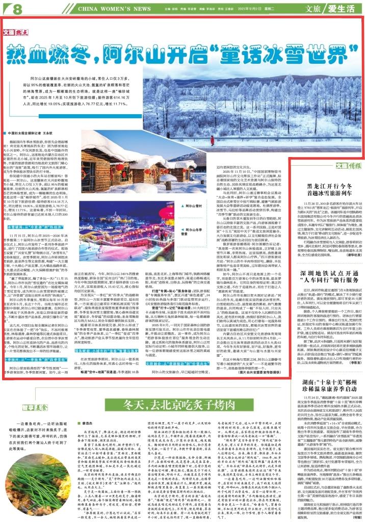 2025年12月2日,《中國婦女報(bào)》第8版刊發(fā)題為《熱血燃冬,阿爾山開啟“童話冰雪世界”》的新聞,報(bào)道了阿爾山,這座地處內(nèi)蒙古自治區(qū)興安盟的東北小城,近年來憑借獨(dú)特的地理優(yōu)勢、豐富的旅游資源和當(dāng)?shù)卣穆貌块T精心推出的“寵客”政策,吸引了國內(nèi)外大批游客,成為冬季體驗(yàn)冰雪快樂的打卡地。