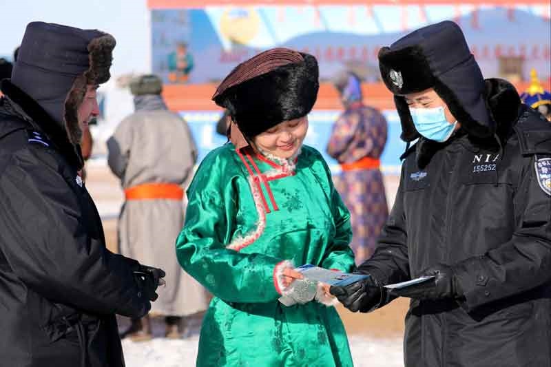 錫林郭勒邊境管理支隊(duì)達(dá)來(lái)、洪格爾、巴音都蘭等3 個(gè)邊境派出所共派出20多名警力,對(duì)于前來(lái)參加那達(dá)慕的人們進(jìn)行嚴(yán)格檢查,并向牧民群眾講解當(dāng)前面臨的新冠肺炎疫情防控形勢(shì),發(fā)放宣傳冊(cè)。(內(nèi)蒙古日?qǐng)?bào)記者 巴依斯古楞 攝影報(bào)道)