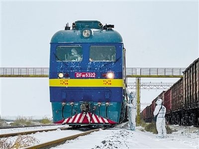 11月6日,二連出入境邊防檢查站執(zhí)勤民警頂風冒雪,對通關列車進行檢查驗放。日前,二連浩特市出現降雪、強降溫天氣,最低溫度降至零下15℃。二連出入境邊防檢查站民警積極做好惡劣天氣下疫情防控、通關服務保障工作,全力保障口岸通關安全順暢。(記者 安寅東 攝)