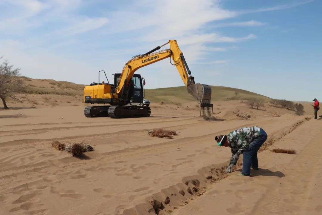 據(jù)錫林浩特市二蛋牧民養(yǎng)殖專業(yè)合作社負責人介紹,在傳統(tǒng)的沙漠治理作業(yè)中,工人需要手動栽植黃柳等固沙植物。然而,人工種植不僅效率低,勞動強度也大。為突破這一困境,合作社成員經(jīng)過多次試驗,最終決定對挖掘機進行創(chuàng)新改造,加裝叉具,這一巧妙的設計不僅實現(xiàn)了對黃柳種植深度和間距的精準把控,還能有效避免土壤翻動,最大程度地保持了土壤水分,切實保護了沙地的生態(tài)環(huán)境?! ?/p>