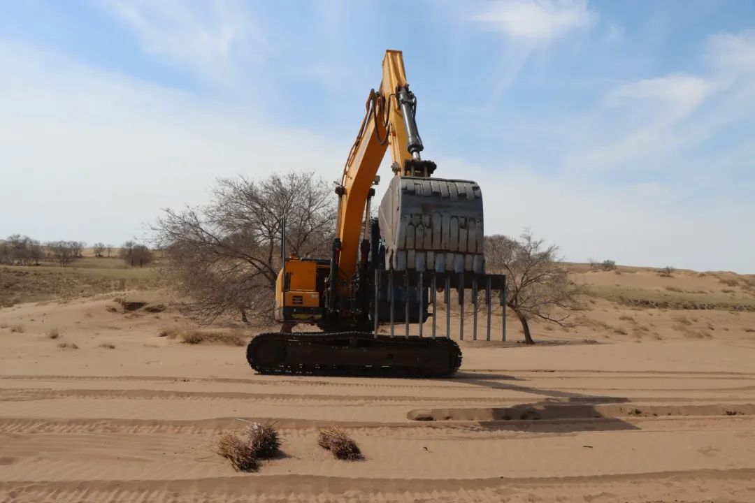 改裝后的挖掘機在治沙工作中展現(xiàn)出了強大的優(yōu)勢。據(jù)了解,以往人工種植時,兩個人一天才能完成一畝地的工作量,五個人最多也只能處理兩畝半到三畝地。而如今,改裝后的挖掘機一天的工作量相當于五個人種植十畝地,不僅大大提升了工作效率,還節(jié)約了大量的人力和物力。原本只能用于挖掘作業(yè)的鉤機,經(jīng)過簡單改裝后,搖身一變成為防塵固沙的“利器”,為沙漠治理工作注入了新的活力。目前,合作社已投入兩臺改裝挖掘機進行作業(yè),并計劃在未來將其數(shù)量增加至五臺,以確保按時完成2025年規(guī)劃中8.4萬畝的治理任務。