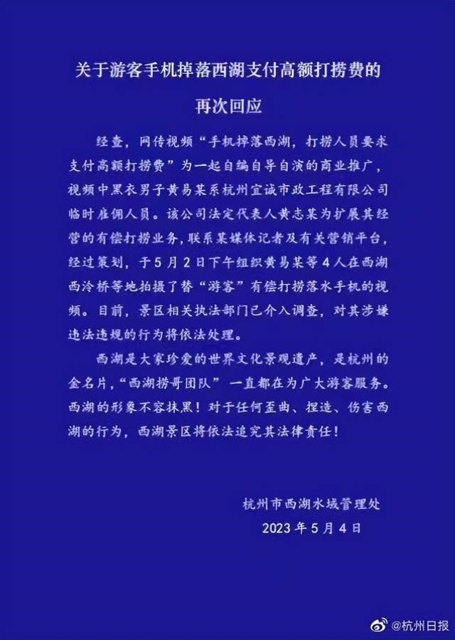 ·西湖景區(qū)再次回應(yīng)“高價撈手機事件”:為自編自導(dǎo)自演商業(yè)推廣。