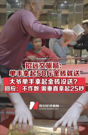 ·山東煙臺招遠(yuǎn)文旅局:單手拿起50斤金磚就送!大爺單手舉起50斤金磚沒拿走?回應(yīng):不作數(shù),需垂直拿起25秒。
