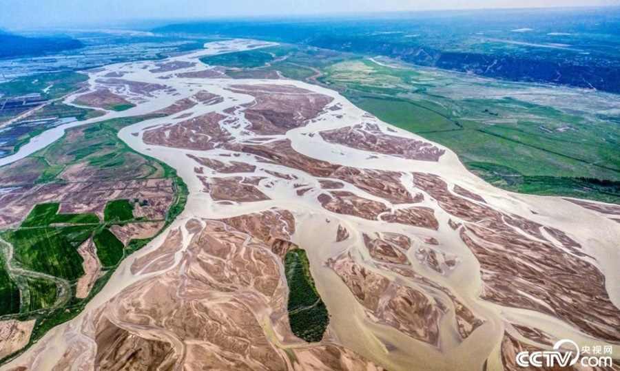 隨著黃河水位下降,山西運城萬榮縣境內(nèi)的黃河河床大面積裸露,河水在主河道上分散成了無數(shù)條大小不等的細(xì)流,形成了黃河特有的景色。
