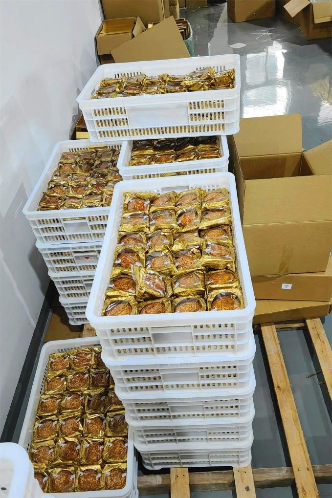 為掩人耳目,王某等人將制作好的散裝月餅運往一外地窩點進行入盒包裝,然后再將包裝好的月餅送往另一外地窩點,由專人負責在盒子外包裝貼假冒的防偽標簽,以假亂真,最后在網(wǎng)絡平臺上以正品2折的低價進行售賣。截至被抓獲當日,該團伙已在網(wǎng)上售賣了1萬余盒假冒品牌月餅,但大部分貨品還未來得及發(fā)貨。