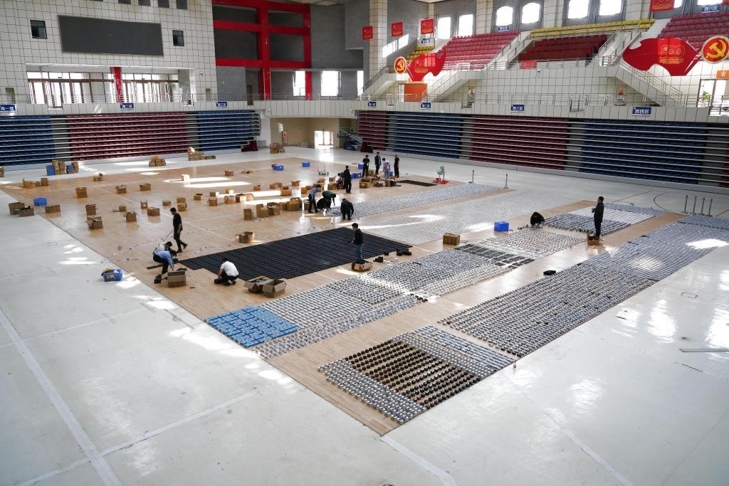 民警在黑龍江省饒河縣一體育館內清點繳獲的竊聽竊照器材。(饒河縣公安局供圖)