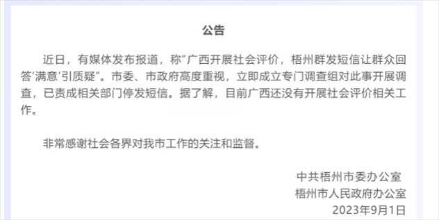 ·網(wǎng)傳廣西開展社會評價,梧州群發(fā)短信讓群眾回答“滿意”,梧州市政府:開展調(diào)查,已責成相關(guān)部門停發(fā)短信。據(jù)了解廣西還未開展社會評價相關(guān)工作。