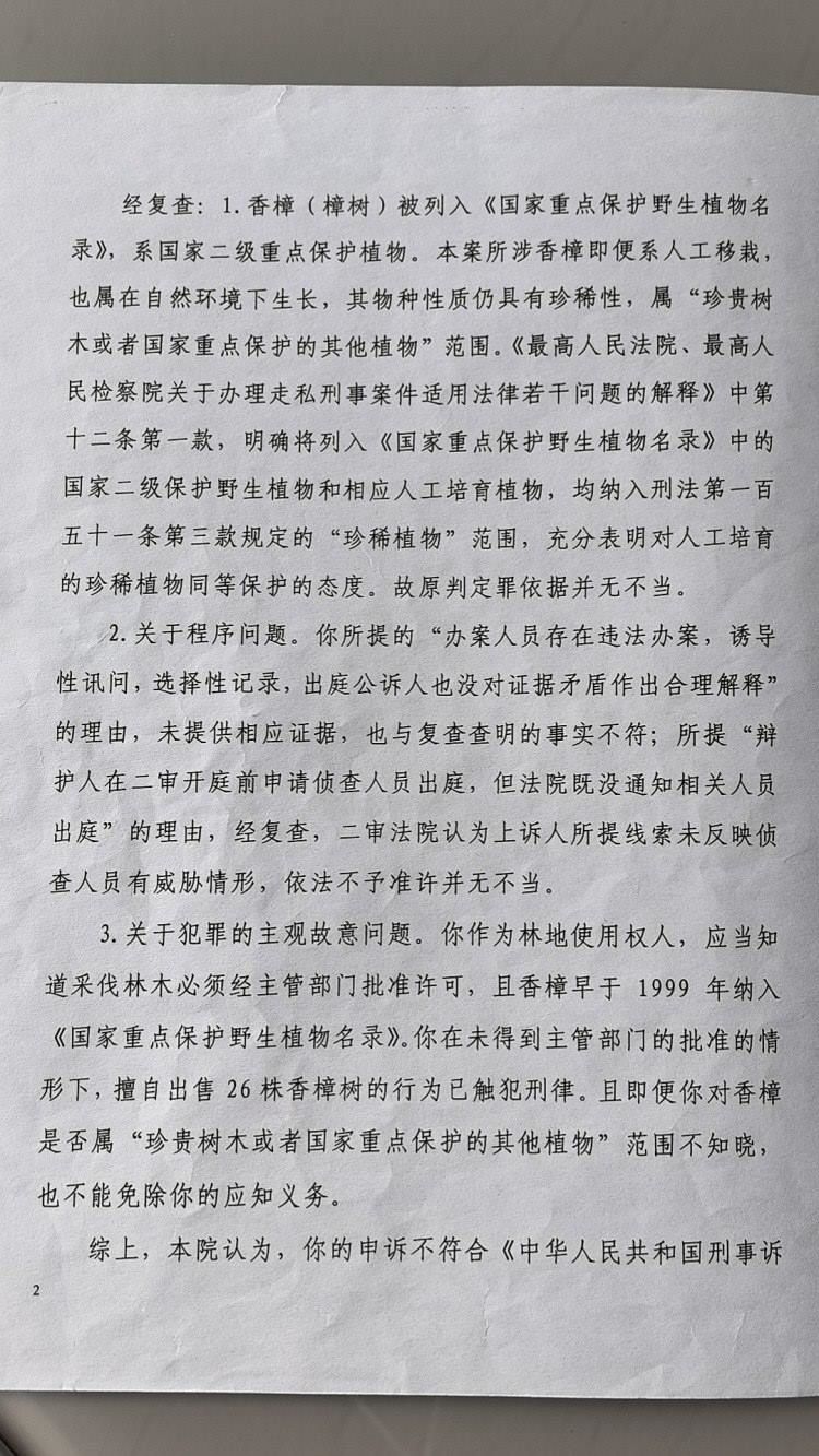 馬萬林的弟弟馬萬春在該案一、二審中擔任其辯護人。他稱,根據(jù)兩高2020年3月發(fā)布的最新司法解釋,“人工培育的植物,除古樹名木外,不屬于刑法第三百四十四條規(guī)定的‘珍貴樹木或者國家重點保護的其他植物’?!蓖瑫r,也有大量指導(dǎo)案例證明,人工種植的香樟樹不屬于國家重點保護植物。