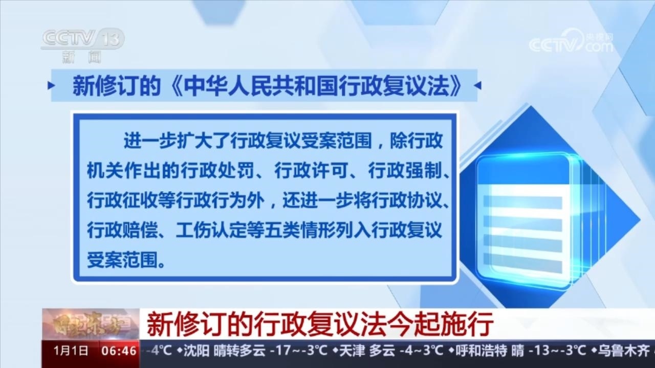 新修訂《中華人民共和國(guó)行政復(fù)議法》1月1日起施行,法律進(jìn)一步擴(kuò)大了行政復(fù)議受案范圍,除行政機(jī)關(guān)作出的行政處罰、行政許可、行政強(qiáng)制、行政征收等行政行為外,還進(jìn)一步將行政協(xié)議、行政賠償、工傷認(rèn)定等五類情形列入行政復(fù)議受案范圍。