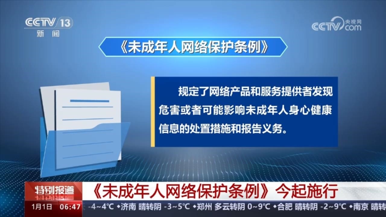 1月1日起施行的《未成年人網(wǎng)絡(luò)保護(hù)條例》是我國(guó)第一部專門性的未成年人網(wǎng)絡(luò)保護(hù)綜合立法。條例規(guī)定,網(wǎng)絡(luò)產(chǎn)品和服務(wù)提供者發(fā)現(xiàn)危害或者可能影響未成年人身心健康信息的處置措施和報(bào)告義務(wù)。