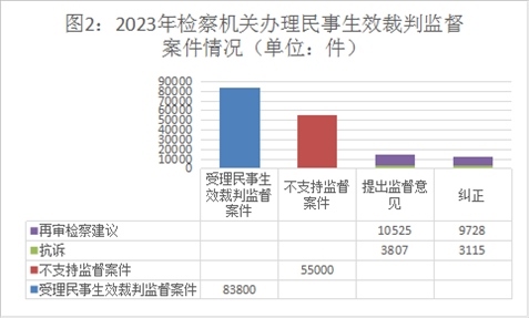 2023年,全國(guó)檢察機(jī)關(guān)始終堅(jiān)持以習(xí)近平新時(shí)代中國(guó)特色社會(huì)主義思想特別是習(xí)近平法治思想為指導(dǎo),認(rèn)真貫徹落實(shí)《中共中央關(guān)于加強(qiáng)新時(shí)代檢察機(jī)關(guān)法律監(jiān)督工作的意見》,以“高質(zhì)效辦好每一個(gè)案件”作為履職辦案的基本價(jià)值追求,以專業(yè)化建設(shè)為基礎(chǔ),以提升辦案能力和水平為目標(biāo),認(rèn)真貫徹實(shí)施民法典,扎實(shí)推進(jìn)民事生效裁判監(jiān)督、審判活動(dòng)監(jiān)督、執(zhí)行活動(dòng)監(jiān)督、支持起訴、虛假訴訟監(jiān)督等各項(xiàng)工作,在完善案卷調(diào)閱制度、民事再審檢察建議制度、促進(jìn)社會(huì)治理等方面取得新進(jìn)展新成效。