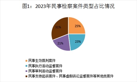 2023年,全國(guó)檢察機(jī)關(guān)民事檢察監(jiān)督規(guī)模進(jìn)一步擴(kuò)大,全流程監(jiān)督格局逐步完善,總體發(fā)展保持均衡態(tài)勢(shì)。全年共受理各類民事檢察案件33.29萬件,案件數(shù)量持續(xù)上升。其中,民事生效裁判案件占受理總數(shù)的25%,民事執(zhí)行活動(dòng)監(jiān)督案件占23%,民事審判活動(dòng)監(jiān)督案件占21%,民事支持起訴案件、民事虛假訴訟監(jiān)督案件等其他類案件占31%。