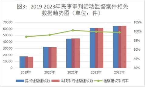 2023年,全國(guó)檢察機(jī)關(guān)共受理民事審判活動(dòng)監(jiān)督案件6.94萬件,同期審結(jié)6.96萬件(含積存)。提出檢察建議6.47萬件,同比上升5.1%,占審結(jié)案件數(shù)的93%,同比增加4.2個(gè)百分點(diǎn)。對(duì)提出的檢察建議,法院同期采納6.46萬件,檢察建議采納率達(dá)99%。一些地區(qū)通過開展專項(xiàng)監(jiān)督,加強(qiáng)辦案力度,提高辦案效果,推動(dòng)民事審判活動(dòng)監(jiān)督向深層次違法監(jiān)督轉(zhuǎn)變。