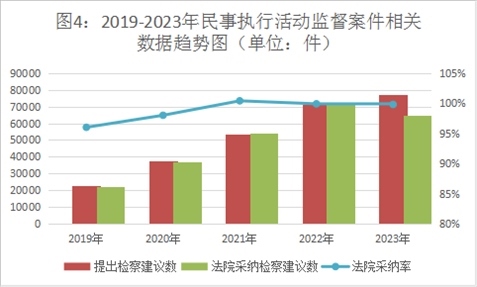 民事執(zhí)行活動(dòng)監(jiān)督辦案效率高,檢察建議采納率保持高位。2023年,全國(guó)檢察機(jī)關(guān)共受理民事執(zhí)行活動(dòng)監(jiān)督案件7.73萬件,審結(jié)7.72萬件。提出檢察建議6.49萬件,占審結(jié)案件的84%,同比持平。對(duì)提出的檢察建議,被監(jiān)督單位同期采納6.48萬件,民事執(zhí)行監(jiān)督檢察建議采納率達(dá)99%。