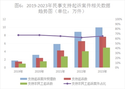 一是民事支持起訴數(shù)量上升較快。2023年,全國(guó)檢察機(jī)關(guān)共受理民事支持起訴案件10.14萬件,同比上升13.9%,審查后支持起訴7.73萬件,其中支持農(nóng)民工起訴5.08萬件。從案件類型上看,主要以勞動(dòng)爭(zhēng)議(占43.9%)、合同糾紛(占33%)、婚姻家庭糾紛(占6.7%)為主。