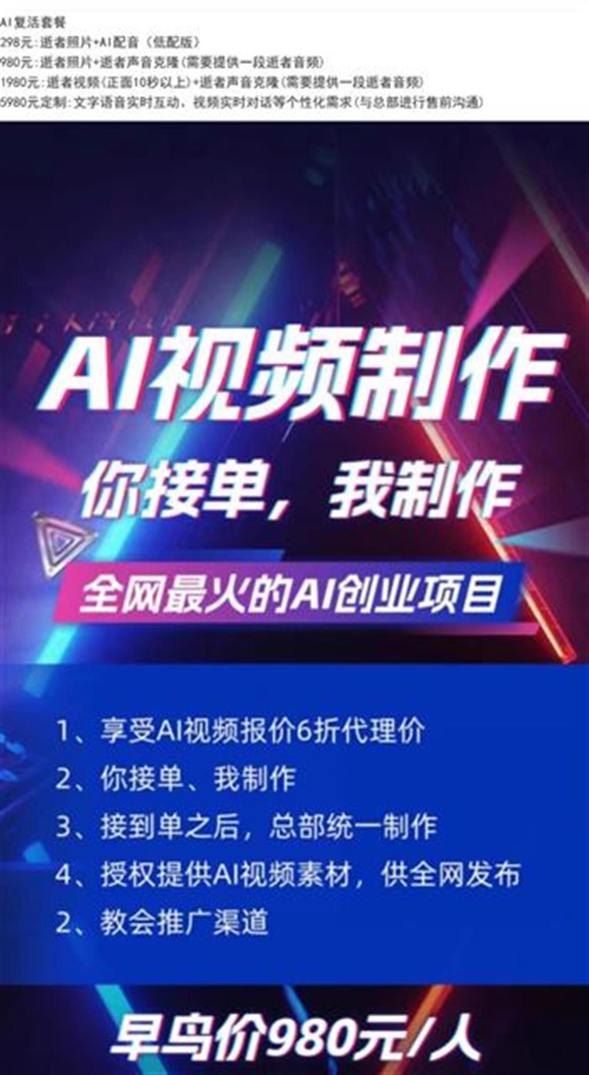 記者私信其中一名“AI復活師”詢問能否制作已逝明星的定制說話視頻,對方表示可以,且有多種模式可供選擇,需要添加微信了解詳情。對方提供的“AI復活套餐”包括“逝者照片+AI配音”“逝者照片+逝者聲音克隆”“逝者視頻+逝者聲音克隆”等服務(wù),價格從298元到1980元不等。除AI視頻服務(wù)外,這名“AI復活師”還表示正在收徒及尋找下游代理,可提供AI視頻制作教學服務(wù)。