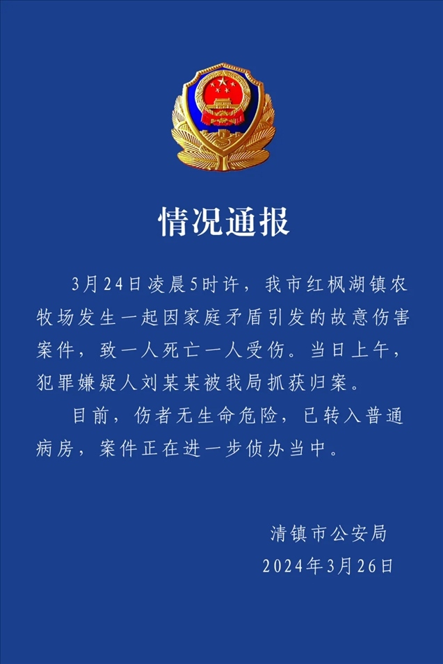 央視網(wǎng)消息:據(jù)貴州清鎮(zhèn)市公安局,3月24日凌晨5時(shí)許,清鎮(zhèn)市紅楓湖鎮(zhèn)農(nóng)牧場發(fā)生一起因家庭矛盾引發(fā)的故意傷害案件,致一人死亡一人受傷。