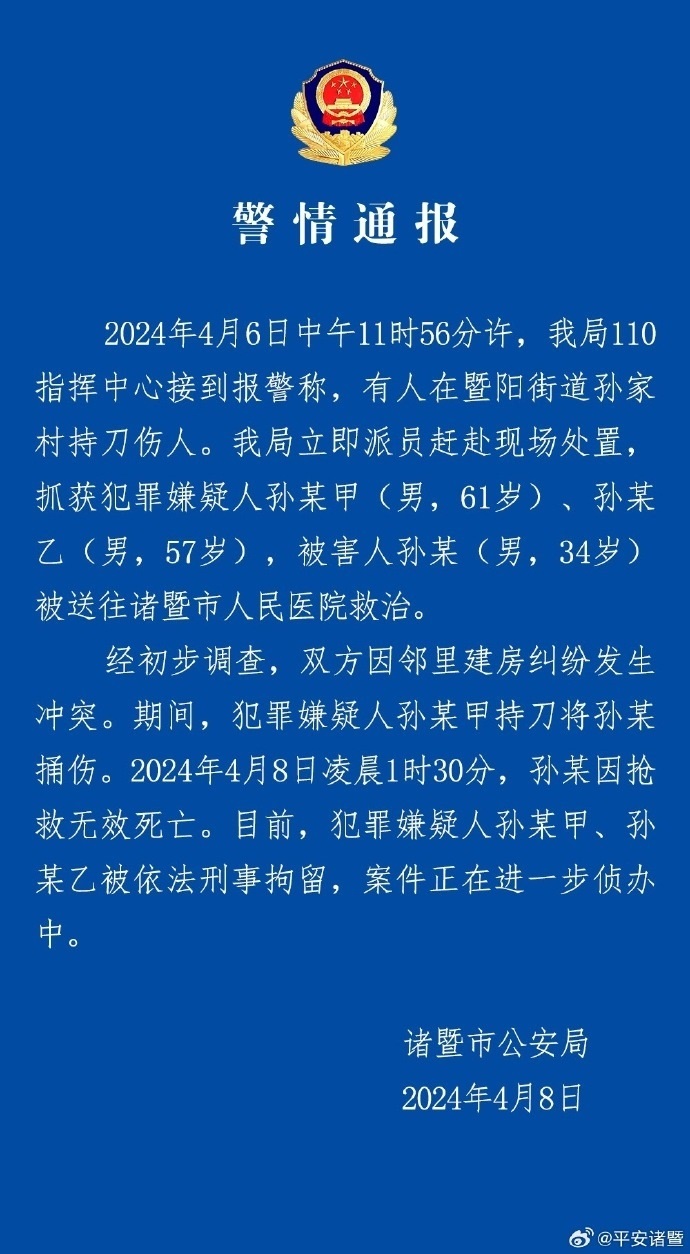 央視網(wǎng)消息:4月8日,浙江諸暨市公安局通報(bào):4月6日中午11時(shí)56分許,我局110指揮中心接到報(bào)警稱,有人在暨陽(yáng)街道孫家村持刀傷人。我局立即派員趕赴現(xiàn)場(chǎng)處置,抓獲犯罪嫌疑人孫某甲(男,61歲)、孫某乙(男,57歲),被害人孫某(男,34歲)被送往諸暨市人民醫(yī)院救治。經(jīng)初步調(diào)查,雙方因鄰里建房糾紛發(fā)生沖突。期間,犯罪嫌疑人孫某甲持刀將孫某捅傷。2024年4月8日凌晨1時(shí)30分,孫某因搶救無效死亡。目前,犯罪嫌疑人孫某甲、孫某乙被依法刑事拘留,案件正在進(jìn)一步偵辦中。
