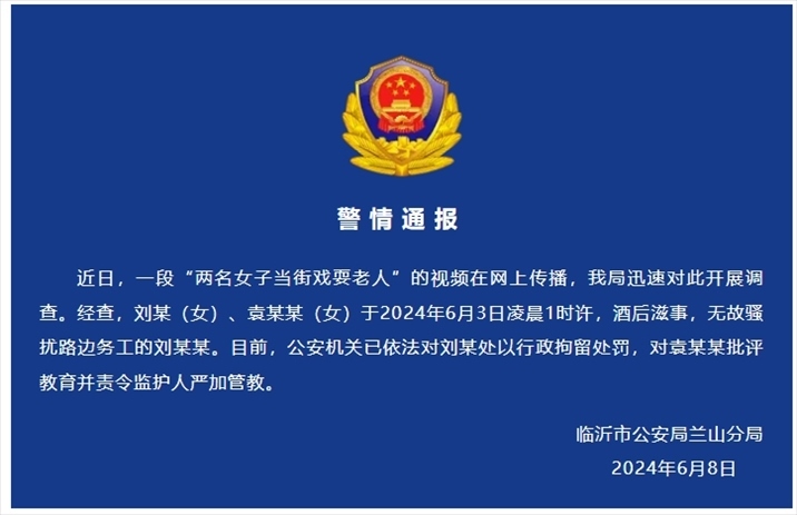 央視網(wǎng)消息:6月8日,臨沂蘭山公安發(fā)布警情通報:近日,一段“兩名女子當街戲耍老人”的視頻在網(wǎng)上傳播,我局迅速對此開展調(diào)查。經(jīng)查,劉某(女)、袁某某(女)于2024年6月3日凌晨1時許,酒后滋事,無故騷擾路邊務(wù)工的劉某某。目前,公安機關(guān)已依法對劉某處以行政拘留處罰,對袁某某批評教育并責令監(jiān)護人嚴加管教。