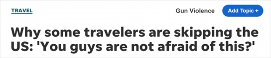 【世界說(shuō)】美媒:槍支暴力問(wèn)題加劇令游客對(duì)赴美旅行望而卻步 中國(guó)日?qǐng)?bào)網(wǎng)2月21日電據(jù)《今日美國(guó)報(bào)》網(wǎng)站18日?qǐng)?bào)道,受......