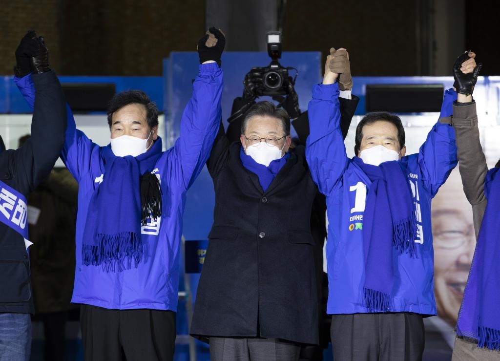 2月15日,候選人李在明(中)在韓國首爾參加競選活動。(新華社發(fā),李相浩攝)