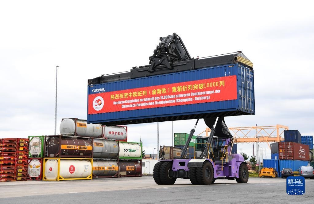新華社德國杜伊斯堡7月11日電(記者朱晟王平平)中國首條中歐班列線路中歐班列(重慶)第10000列重箱折列接車儀式11日在德國杜伊斯堡市DIT場站舉行。
