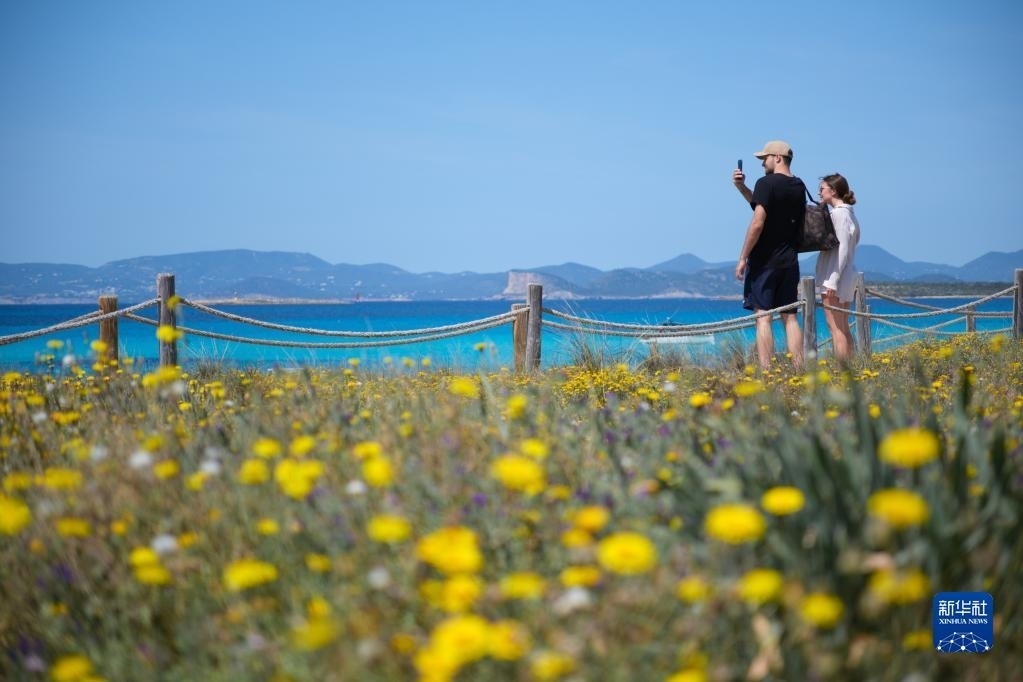 4月11日,游客在西班牙巴利阿里群島福門特拉島海邊游覽。