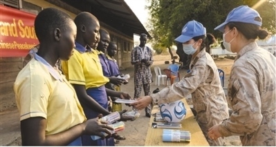 中國(guó)第九批赴南蘇丹(朱巴)維和步兵營(yíng)長(zhǎng)巡分隊(duì)官兵在丹蒙加拉為當(dāng)?shù)貎和?zèng)送文體用品。 中國(guó)赴南蘇丹(朱巴)維和步兵營(yíng)供圖
