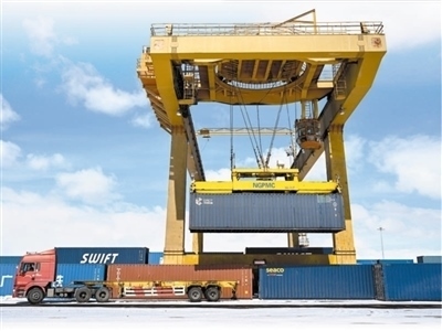 一輛貨車在滿洲里站貨運(yùn)車間集裝箱場(chǎng)裝卸集裝箱。滿洲里口岸是中國(guó)最大的陸路口岸,也是中歐班列東通道進(jìn)出境重要口岸。新華社記者 貝 赫攝
