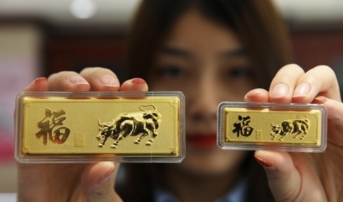 一家金店的工作人員展示賀歲金條。新華社發(fā)(趙曉明 攝)