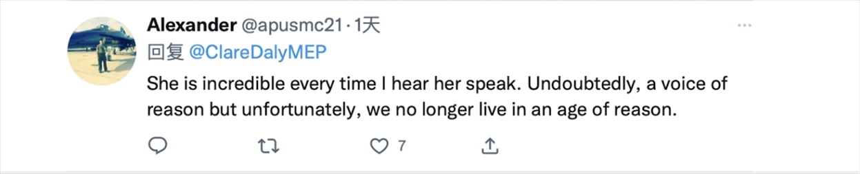克萊爾·戴利的推文正是她在歐洲議會(huì)發(fā)言中所提到的內(nèi)容。在視頻中,克萊爾·戴利首先抨擊了西方對華問題上的雙標(biāo)行為。她在發(fā)言時(shí)稱,“人們在暴露分裂的同時(shí)談?wù)撝鴪F(tuán)結(jié),他們一邊在歐盟向?yàn)蹩颂m提供武器,一邊與中國談?wù)摵推?。他們哀嘆中國在臺(tái)灣地區(qū)‘挑釁’,但對美國干涉國際公認(rèn)的中國領(lǐng)土卻只字未提。”