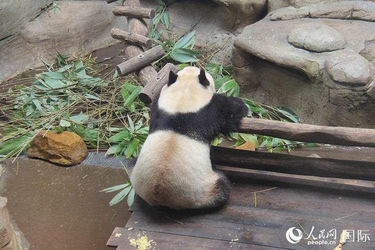 記者趕到時,離開爸爸媽媽單獨(dú)生活的“圓夢”正躺在木床上呼呼大睡,四仰八叉的可愛模樣吸引游客們紛紛駐足,拍照留念。動物園工作人員介紹說,“圓夢”現(xiàn)在已經(jīng)五歲多了,體重超過100公斤,身高也同成年大熊貓無差,活潑好動、元?dú)鉂M滿。隨著飼養(yǎng)員往園內(nèi)投入新鮮的竹子,“圓夢”也慢慢醒過來,開始享用竹子大餐?!拔铱梢砸徽煸谶@里看它吃飯!真的太可愛了!這是我在動物園最喜歡的動物!”今年8歲的梅麗莎興奮地說。
