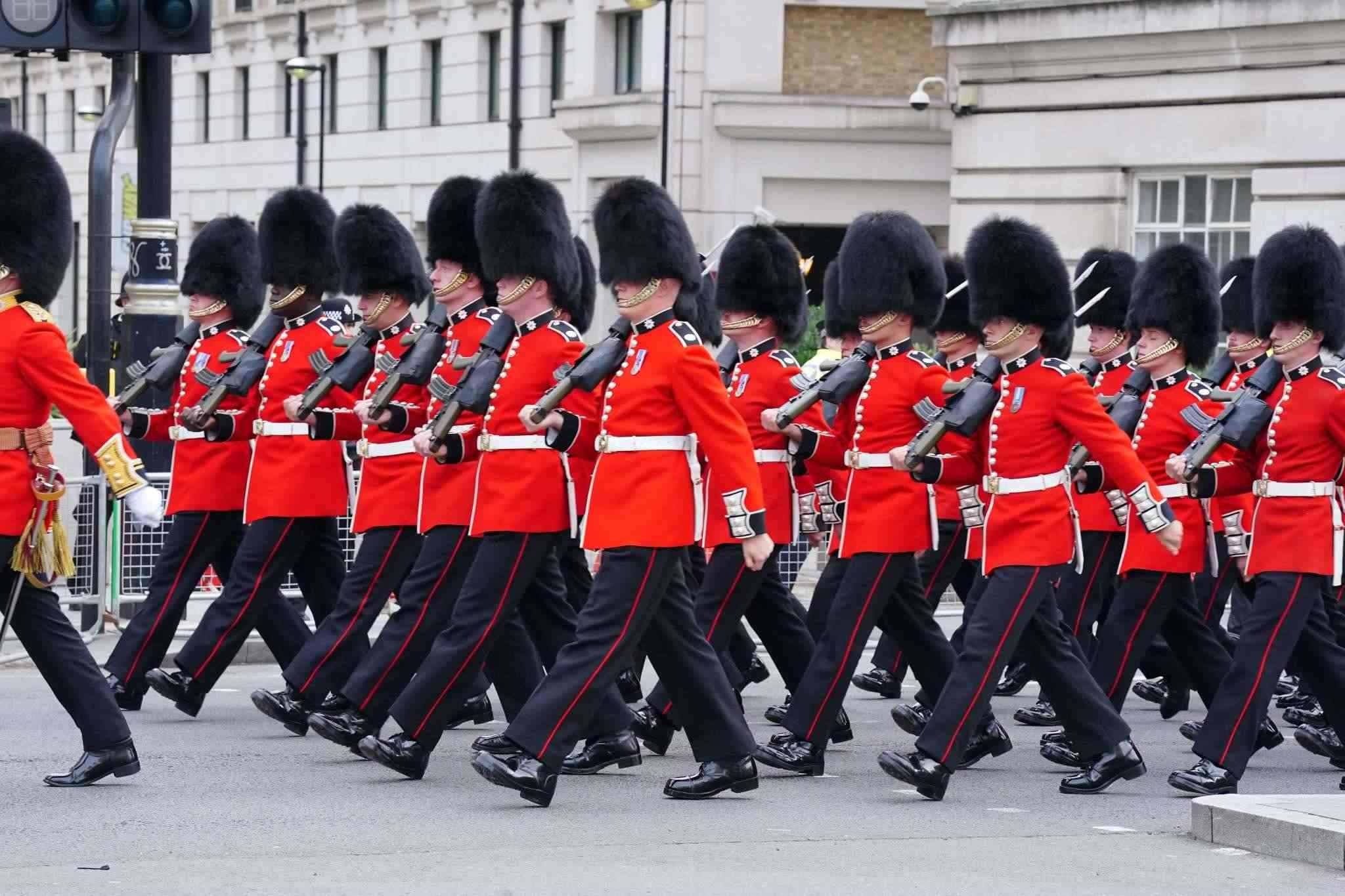 當?shù)貢r間2023年5月6日,英國倫敦,皇家武裝部隊成員抵達倫敦,參加查爾斯三世加冕典禮。視覺中國