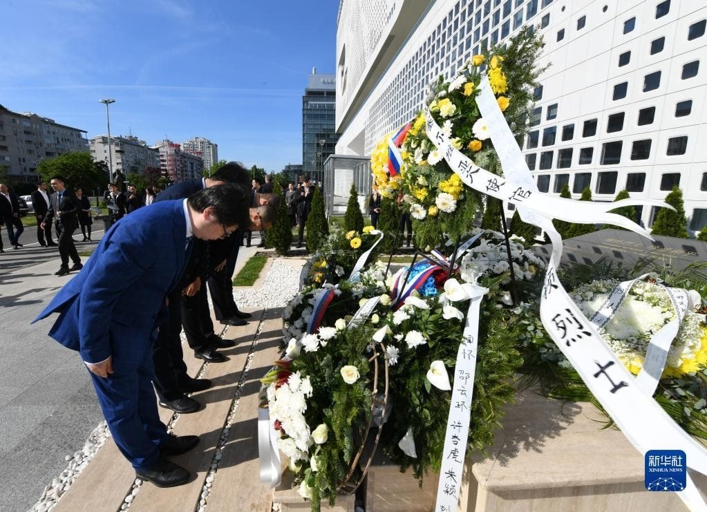 5月7日,在塞爾維亞貝爾格萊德,中資企業(yè)代表向中國駐南斯拉夫聯(lián)盟大使館舊址前的烈士紀念碑鞠躬。